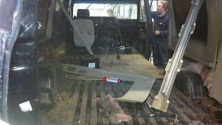 Ei saatu sillä väliseinää irti, niin jatkettiin sitten takapenkin puolelta. Irrotettiin sieltä takapenkki, joka oli kiinni sellasessa puusta tehdyssä säilytystilassa ja se revittiin sitten penkin jälkeen irti. Tän jälkeen päästiin sitte väliseinään käsiks ja saatiin potkimalla seinä irti =D ei muuten lähteny. Tämän jälkeen taas kerättiin kaikki talteen menevät osat pöydälle ja ruvettiin sitten repiin lattiasta mattoo irti. Matto kun oli saatu irti osa rupesi repimään huopaa lattiasta pois ja osa taas jatkoi sitten vaneerin irrotusta, mikä löyty sieltä maton alta. Vaneeri oli niin huonossa hapessa, ettei paljoo vaadittu sen irrotuksee. Vaneeri oli homeessa ja ihan mätä. Kerettiin myös välissä irrottaan muuten apukuskin penkkikin! Näiden irrotusten jälkeen revittiin muovit irti "seinistä", nekin oli huonossa hapessa ja haju oli karmee! Samalla irrotettiinkin sitten spottilamput katoista pois ja seinistä villat. Villoista löytyi hiirenpesä ja katosta myös. Viimisenä sitten lähtikin ikkunat.